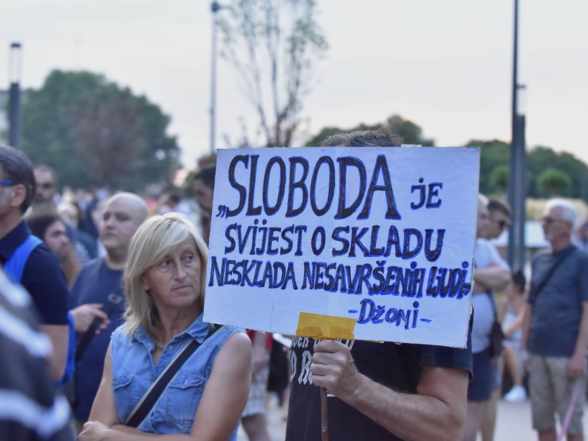 Pored dobro poznatih, bilo je i novih transparenata, na kojima piše “Ne sramotite više ni sebe ni nas, odlazite” i “Imate li vi libelu”.