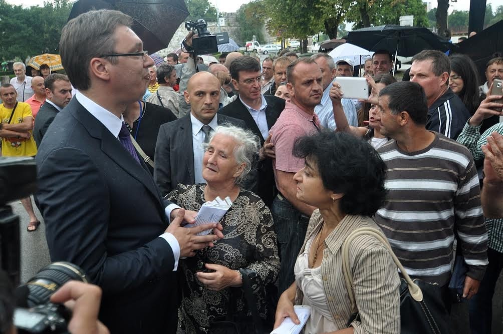 Uzeo vucic od Cvetnu pijac 10 prodavca mucenika i obeceo im da za 2 godine nece morati da placaju dazbine za tezge i da ce patlidzan da bude 350din,pa vidis kako ga baka vuce za ruku !