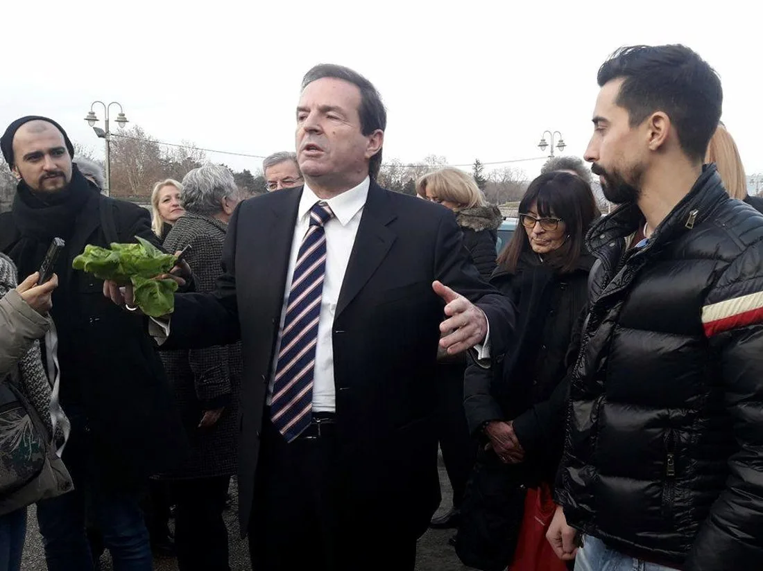 Karića je dočekalo dvadesetak ljudi, a on je rekao da će salata postati vijagra kako bi se rađala deca i najavio veliki miting.