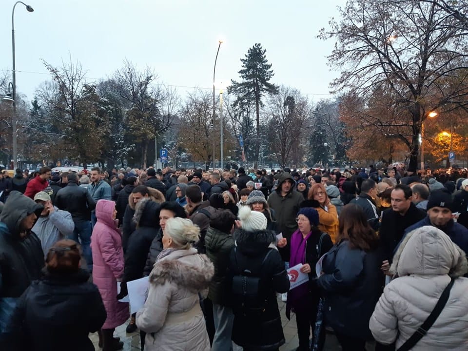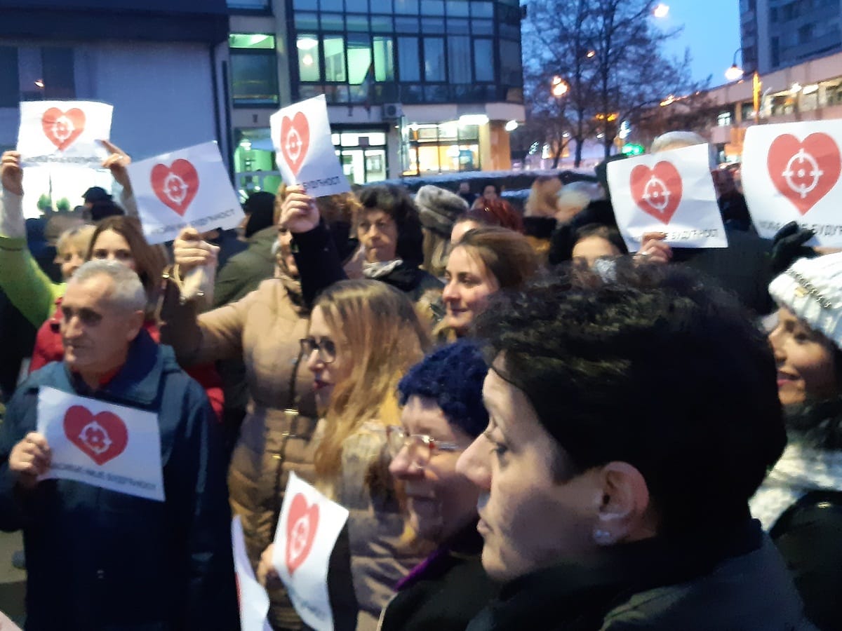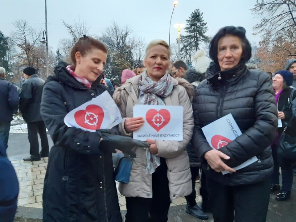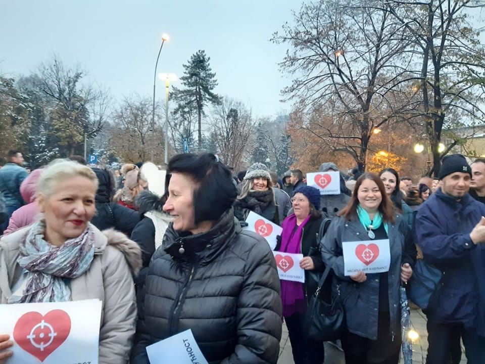 Sneg i niska temperatura nisu bili problem za brojne Leskovčane i funkcionere SNS da se okupe ispred Narodnog muzeja, i nakon toga, uz transparente “Naše mete su mir i stabilnost”, “Nasilje nije hrabrost”, “Leskovac je uz Vučica” i odštampane letke sa natpisom „Nasilje nije budućnost“ u srcu sa iscrtanom metom, prošetaju centrom grada.