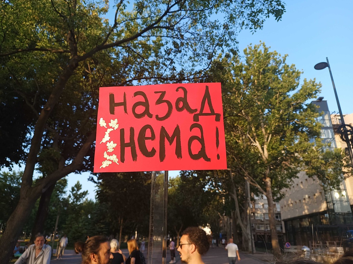 Građani nose transparente sa natpisima „Budi kao policajka Katarina Petrović“, „Budi kao načelnik Slobodan Milenković“, „Ćale, ovo je za tebe“, „Nema nazad“, a čuli su se i zvižduci za Vulina i Gašića.Okupljenima se prvo obratila aktivistkinja Danijela Vujošević koja je pročitala zahteve protesta.