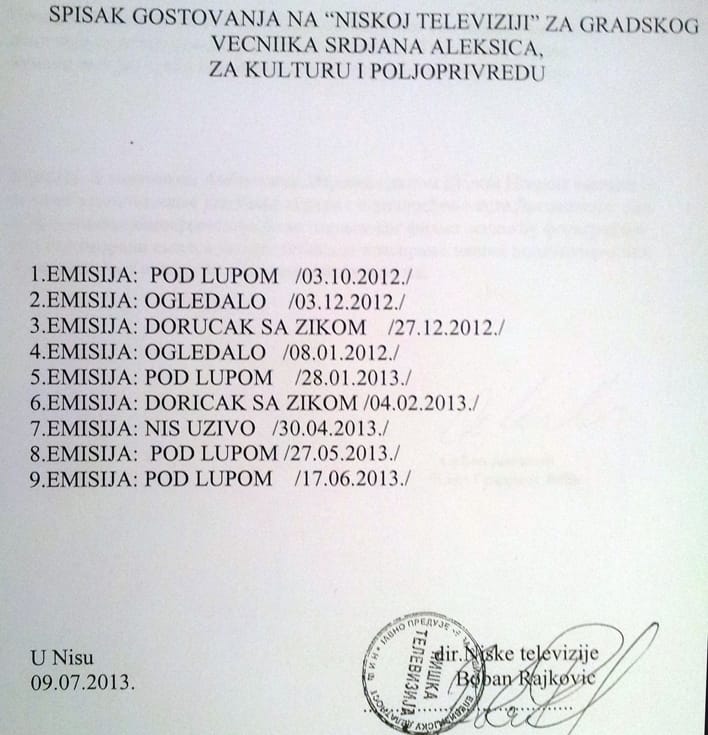 Niški većnik zadužen za kulturu i poljoprivredu osim što u svoje najveće izazove ubraja rešavanje problema pasa lutalica i „pada na ledu na javnoj površini“, u izveštaj o svom jednogodišnjem radu dodao je i overenu kopiju potvrde o gostovanjima na Niškoj televiziji.