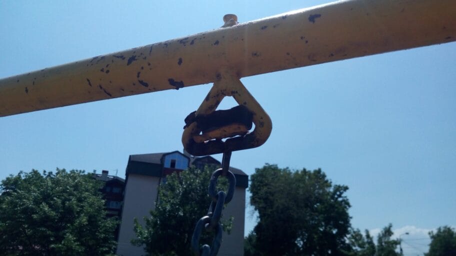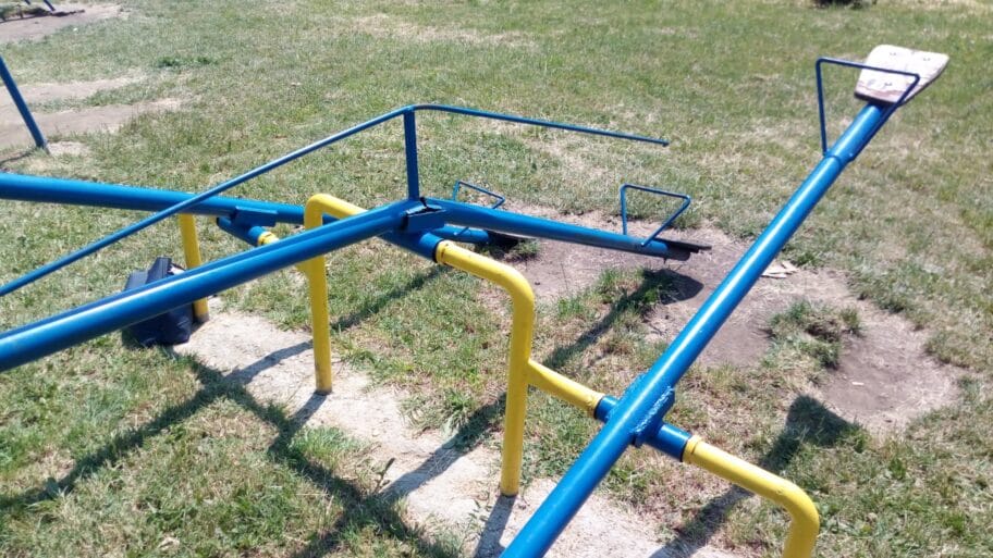 Polomljena ljuljaška, koja je privremeno nameštena, zaglavljena. Lako može da se otkači dok je dete na njoj. Klackalica je polomljena i viri šipka na koju možete veoma lako da se povredite.