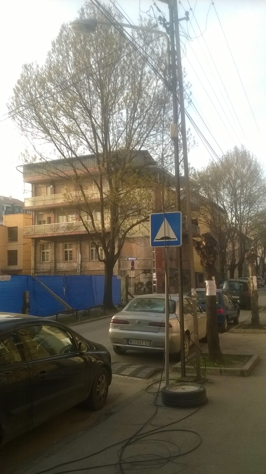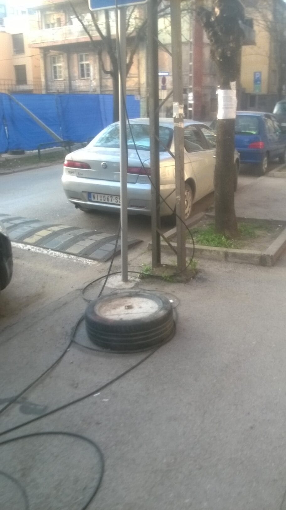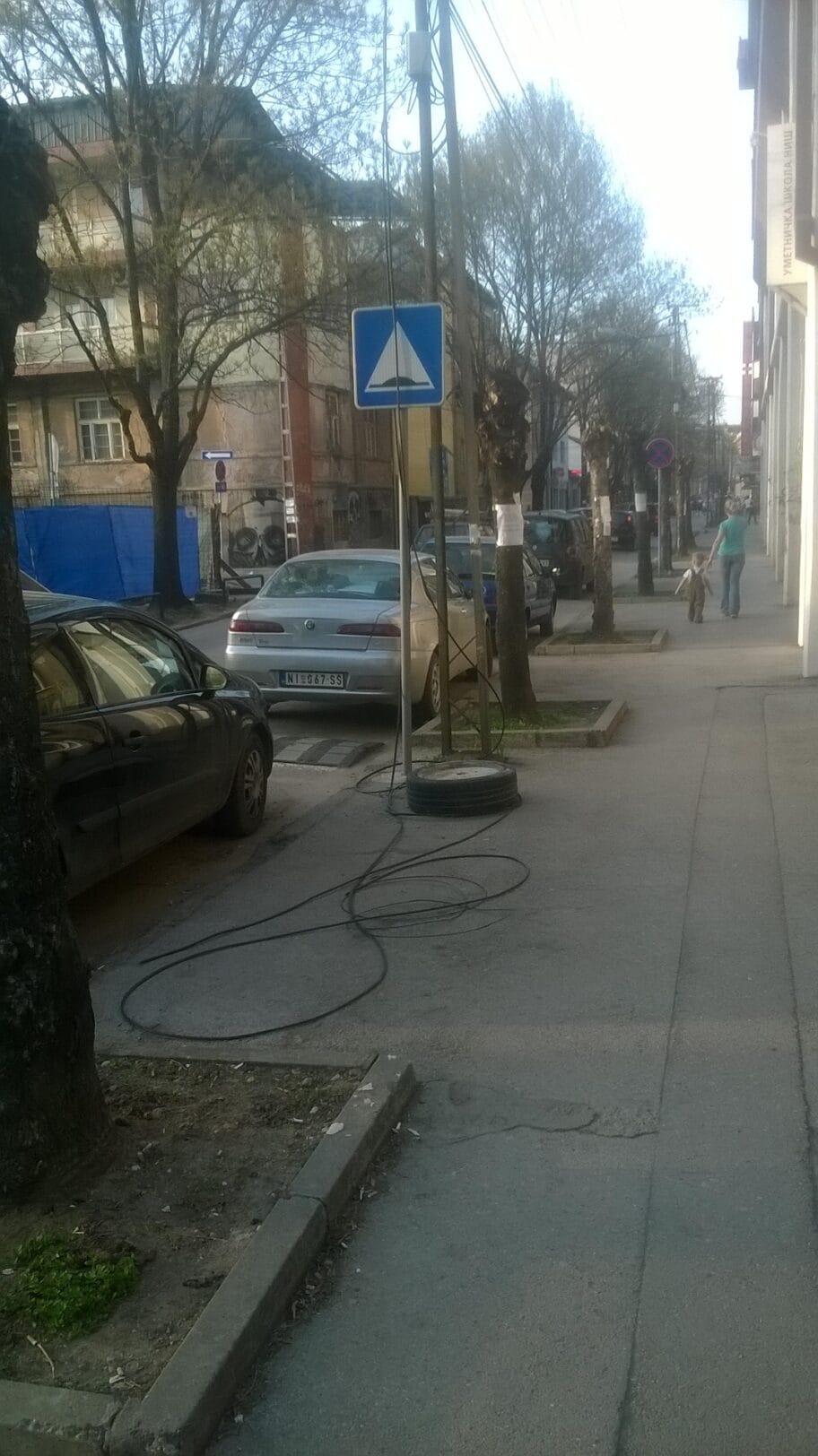 Kao što sam već pomenuo u prethodnoh prijavi, sa bandere vise kablovi već mesecima i razvlače se po zemlji. Verovatno nisu pod naponom, ali se ljudi sapliću o njih svakodnevno. Nalaze se pored samog ulaza u umetničku školu u prvomajskoj ulici i tu su vec najmanje 3 meseca