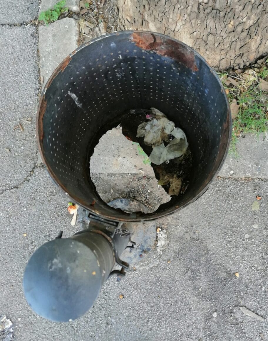 Na stanici na Bulevaru Nemanjića, ispred zgrade 74, kanti za smeće fali dno.