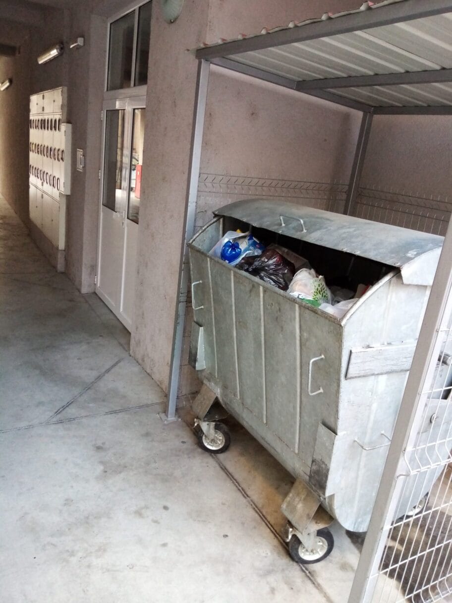 Nepropisno postavljen kontejner pored ulaza zgrade i prozora kuhinje stanara. Ul Jovana Skerlića 26.