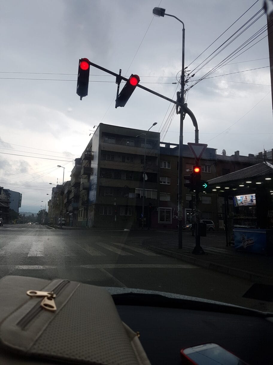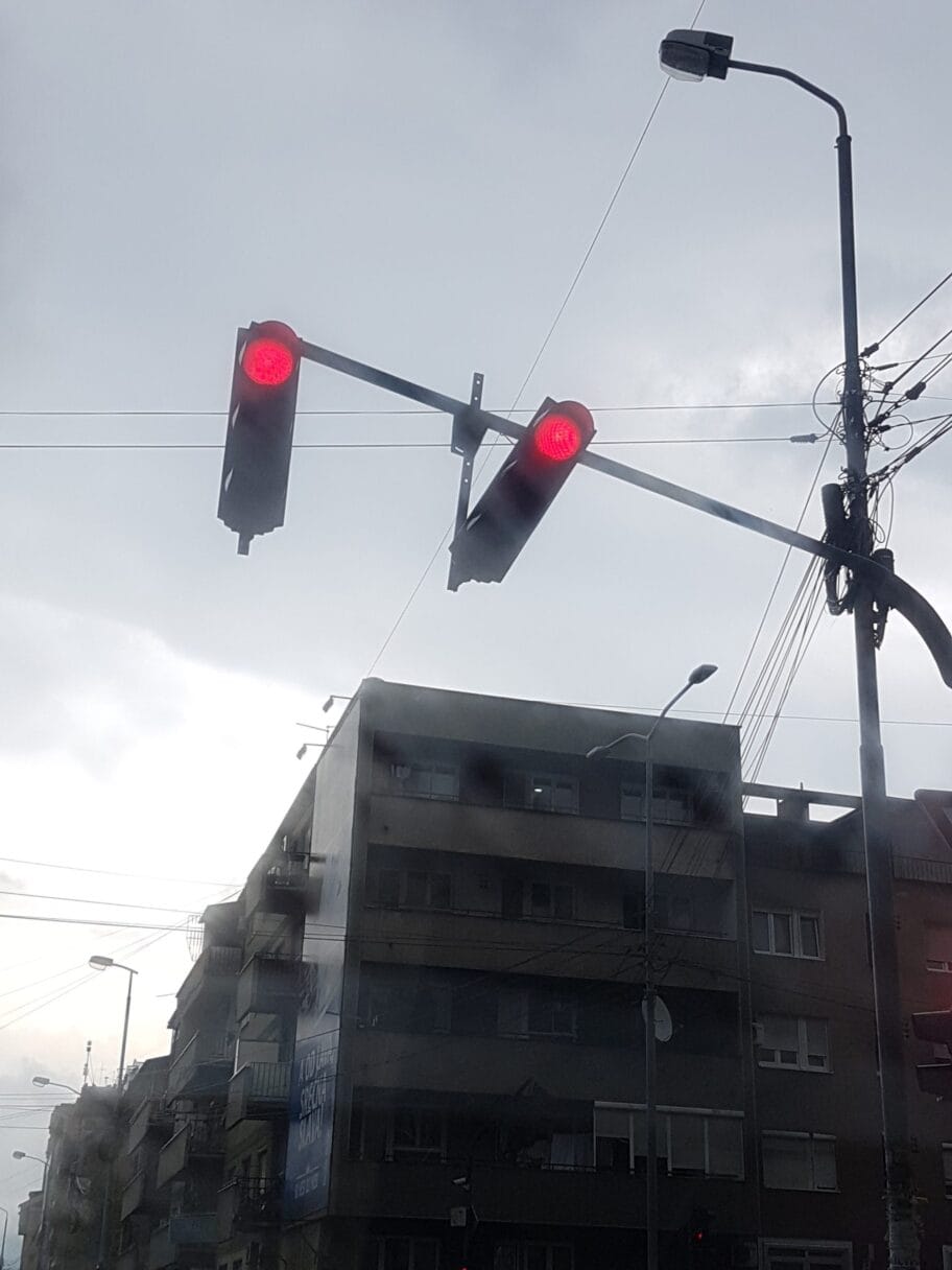 Otkacen je semafor za pravo na crvenom pevcu, kod galerije podova. Iz pravca caira kad se ide ka domu zdravlja