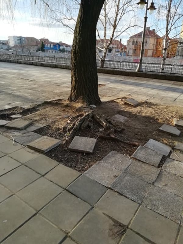 Gomila polomljenih ploča na šetalištu na keju ispred SBB-a. Drvo je korenjem izbacilo ploče iz zemlje i vremenom je prostor u prečniku od 3 metra ostao go i blatnjav.
