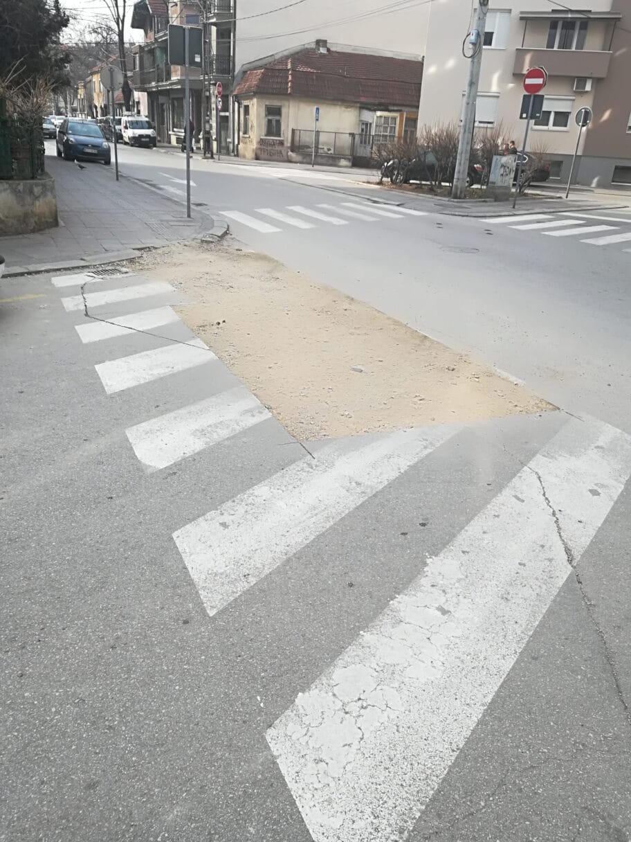 Početkom decembra 2019. počelo raskopavanje ulice. Direkcija grada je obećala da će sanirati rupu. 12.01.2020. nastavljeno raskopavanje i sada je duplo veća rupa (skoro ceo pešački prelaz). Nakon prve objave prognozirao sam da će aprila biti rešen problem i mislim da nisam pogrešio.