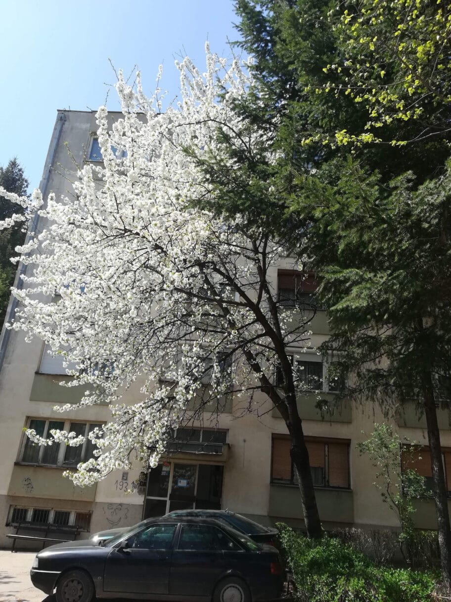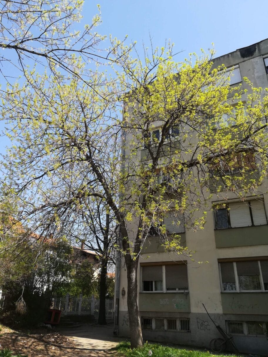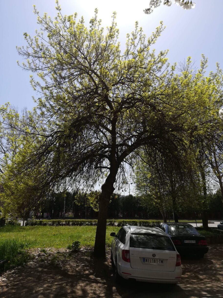 Slikano pre cvetanja. Sada su grane još više savijene i preti opasnost od pucanja istih, što bi dovelo do katastrofalnih posledica s obzirom na to da se deca igraju u navedenom području, stanari prolaze i ima mnogo parkiranih automobila.
