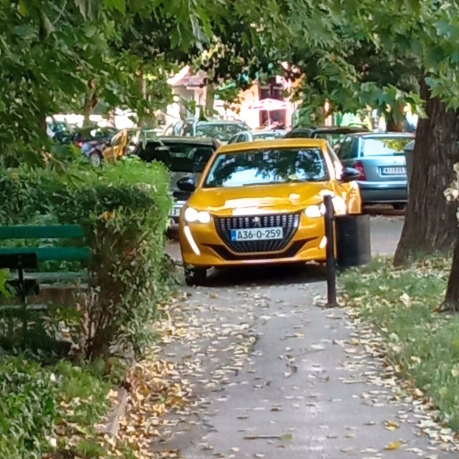 Radnih brigada 3, čovek blokirao kolima trotoar i tako stoji bar pola sata, iza njega se nalazi parking