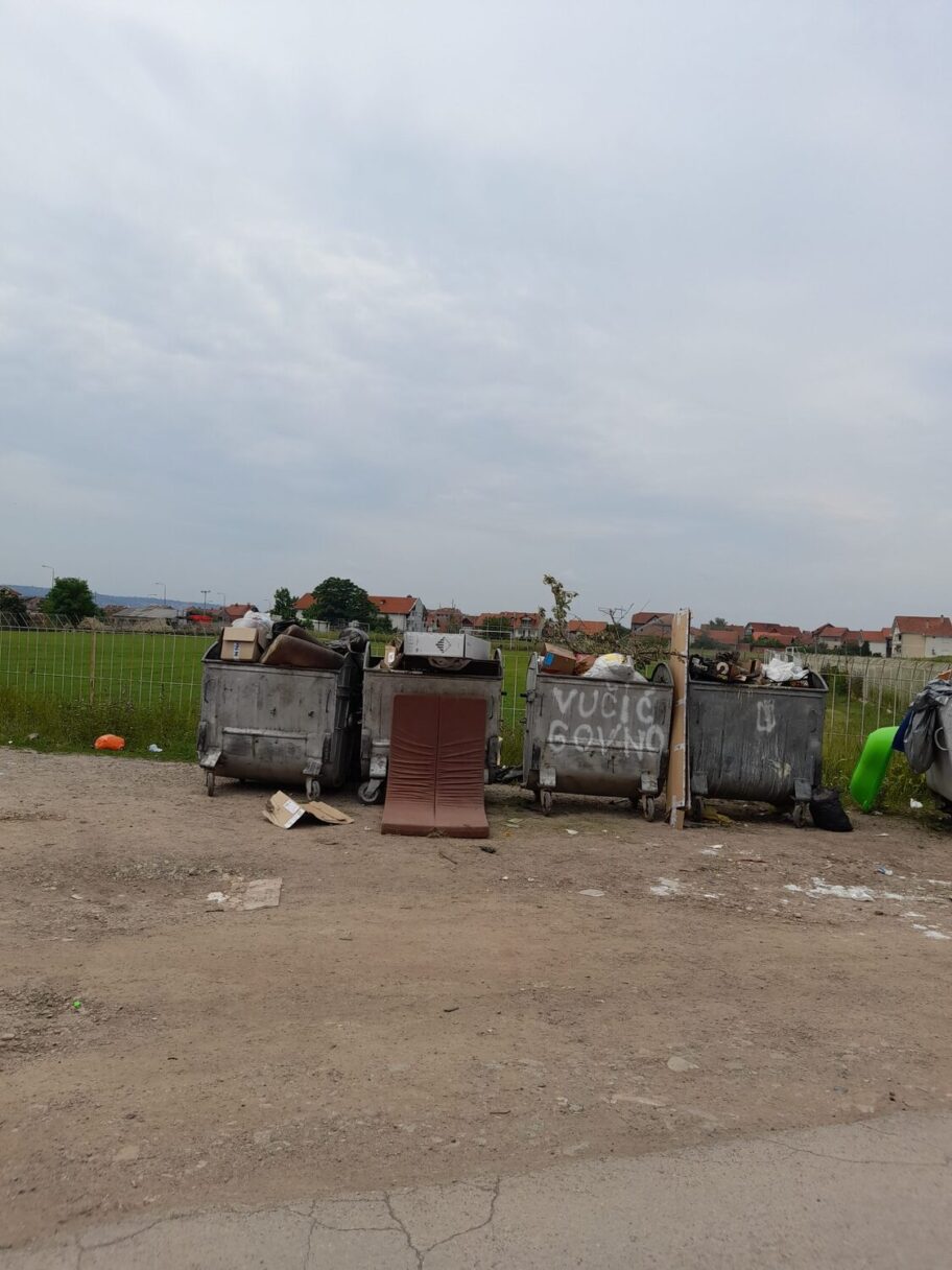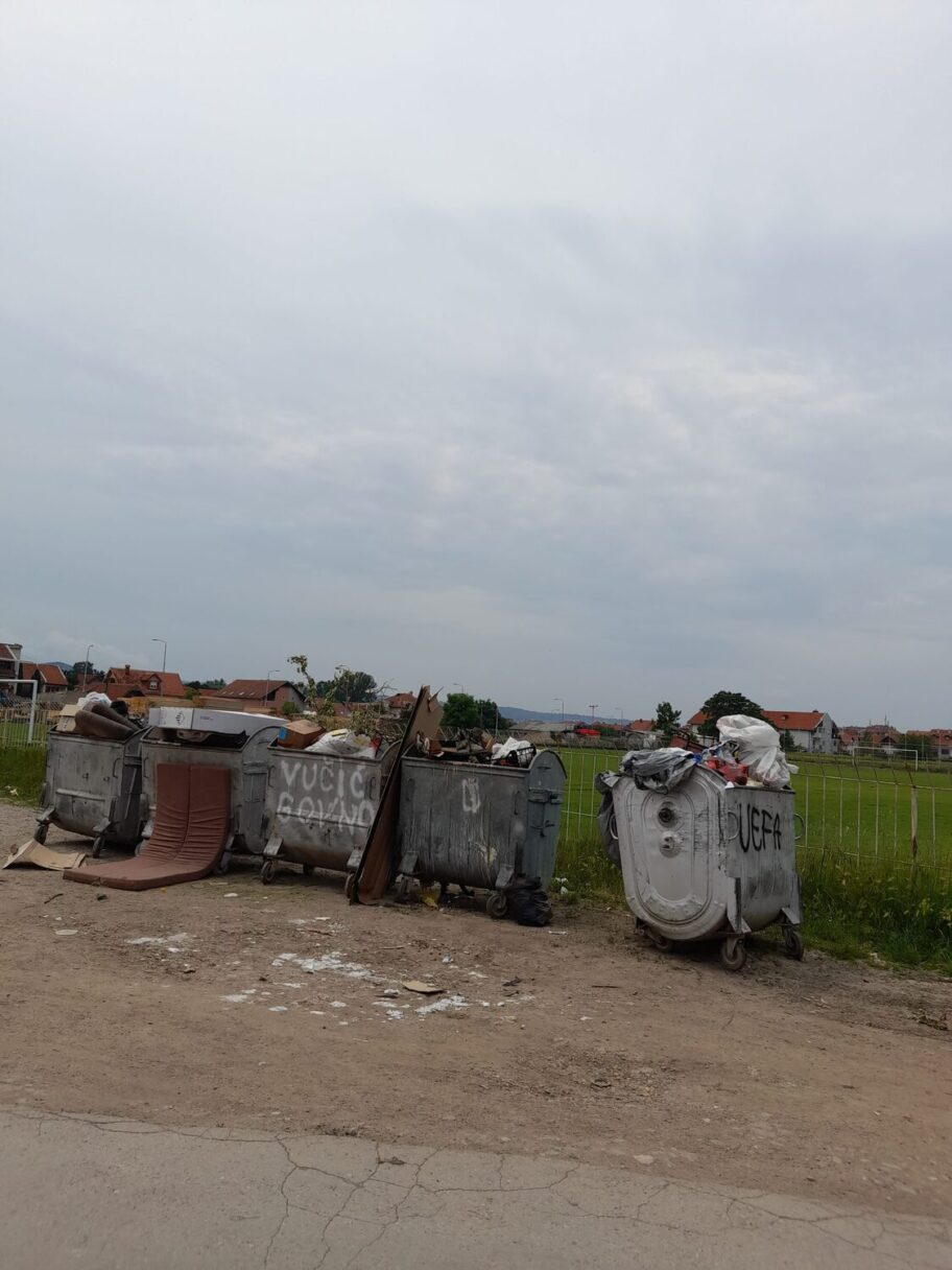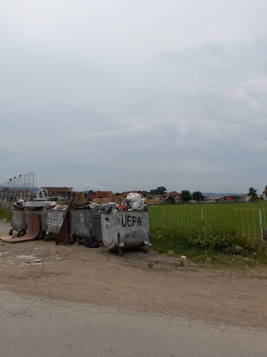 Kontejneri za smece postavljeni uz sam fudbalski teren u Donjoj Vrezini (FK Proleter)...a pored toga ometaju kretanje pesaka pre svega dece jer u tom delu nema ni trotoara...strasno