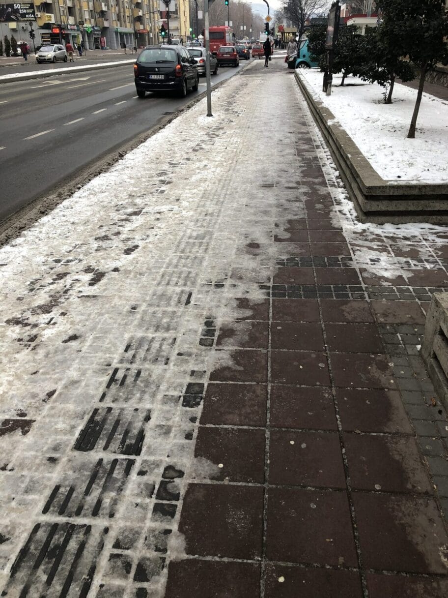 Trotoari neočišćeni od snega stvaraju velike probleme pešacima. Otopiće se kada poraste temperatura, ali do tada ko zna koliko ljudi će završiti na ortopediji.