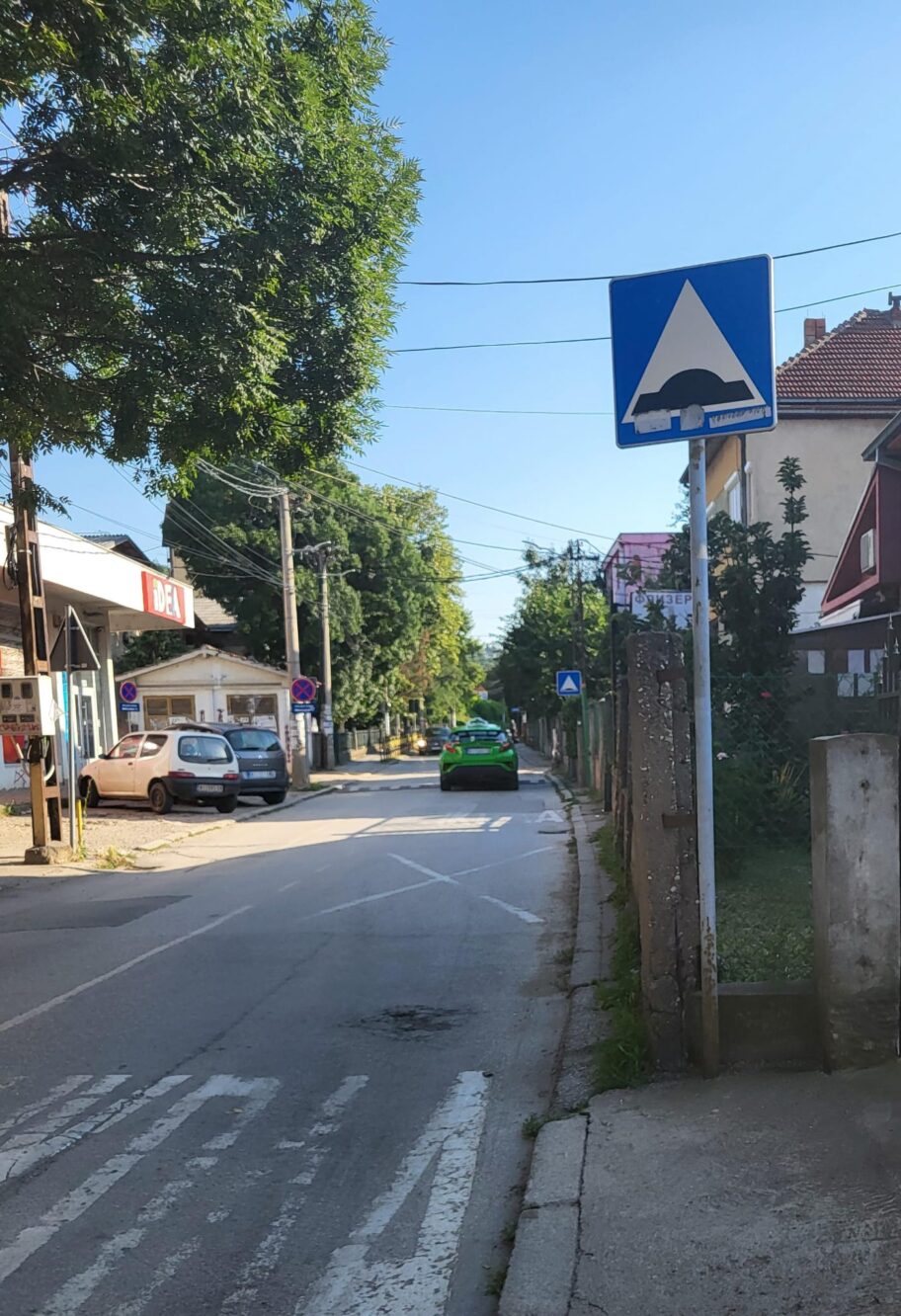 Na ovom mestu prakticno ne postoji trotoar odmah pored osnovne skole i prometne raskrsnice, a sa druge strane su uvek parkirana vozila, pa su ljudi primorani da idu po putu. Deca i vozaci stalno rizikuju kad prolaze ovuda. A najverovatnije je problem u tome sto su ljudi produzili svoja dvorista za po metar na crno.