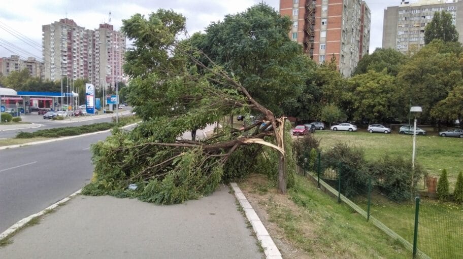 Mlado stablo skroz oboreno nakon današnjeg vetra. Krošnja je skroz preko trotoara.