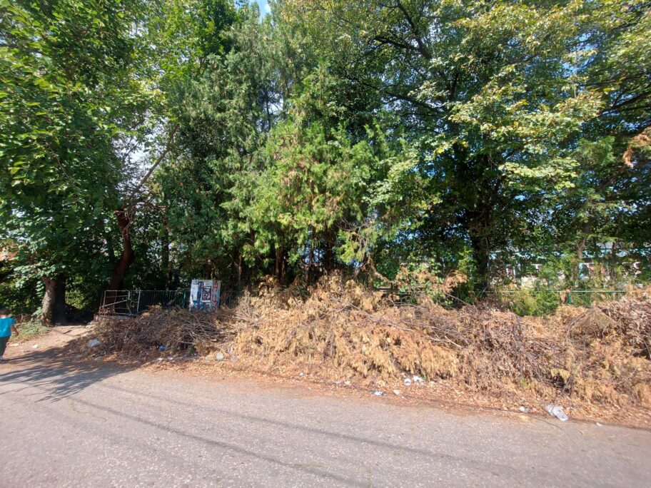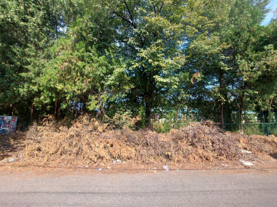 Orezivanje drveća kod skole Cegar bilo je početkom leta. Svo orezano granje trune na ogradi škole.