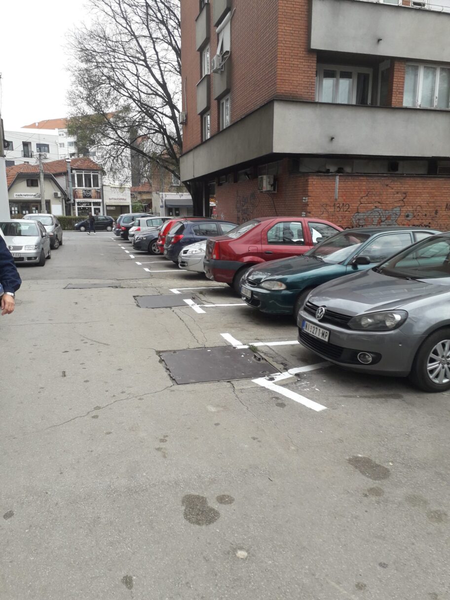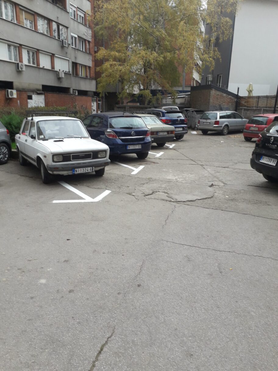 radnici JKP"Parking servis",uz sadejstmo kom.milicije-a ispred najveće zgrade u Nišu,ucrtavaju parking mesta za naplatu,bez pravnog osnova,suprotno potpisanom Protokolu.