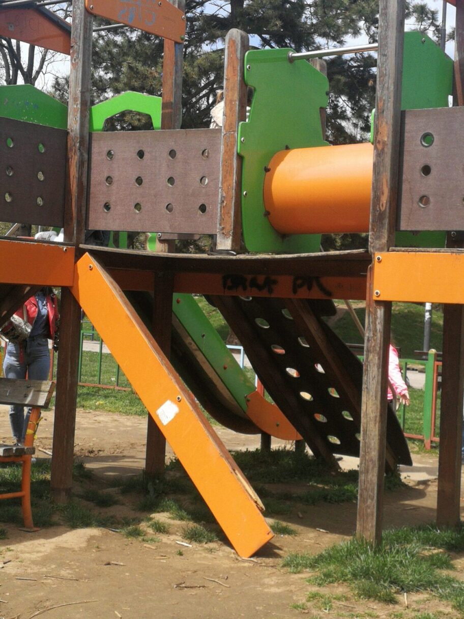 U parku Čair polomljen je mobilijar za decu, vikend je i gužva i ne može se svako dete upozoravati posebno da se ne penje. Mobilijar je u ovakvom stanju već otprilike već mesec dana, vidi se da je neko iz grada dolazio i da zna za problem, medjutim samo je oblepio to trakom koja je sada pocepana