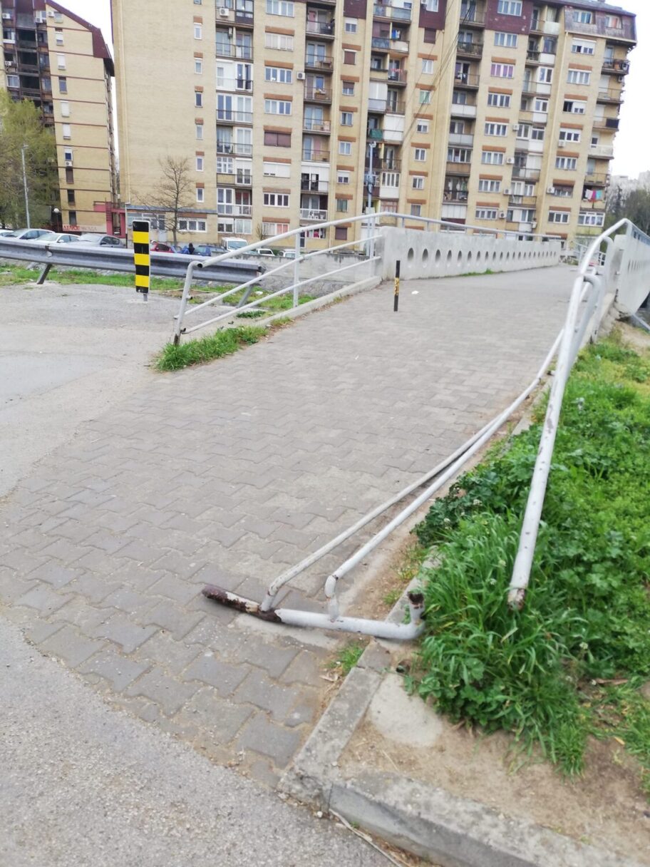 Molim vas za prijavu ovog oštećenja ograde mosta preko Gabrovačke reke, na kraju Djerdapske ulice. Deca, biciklisti i stariji su u opasnosti od povredjivanja. Takodje su i stubići koji ne dozvoljavaju prelazak većim motorima uklonjeni, pa je prelaz preko mosta rizik za pešake zbog čestih prelaza motorima. I njih treba vratiti na ovaj pešački most. Hvala.