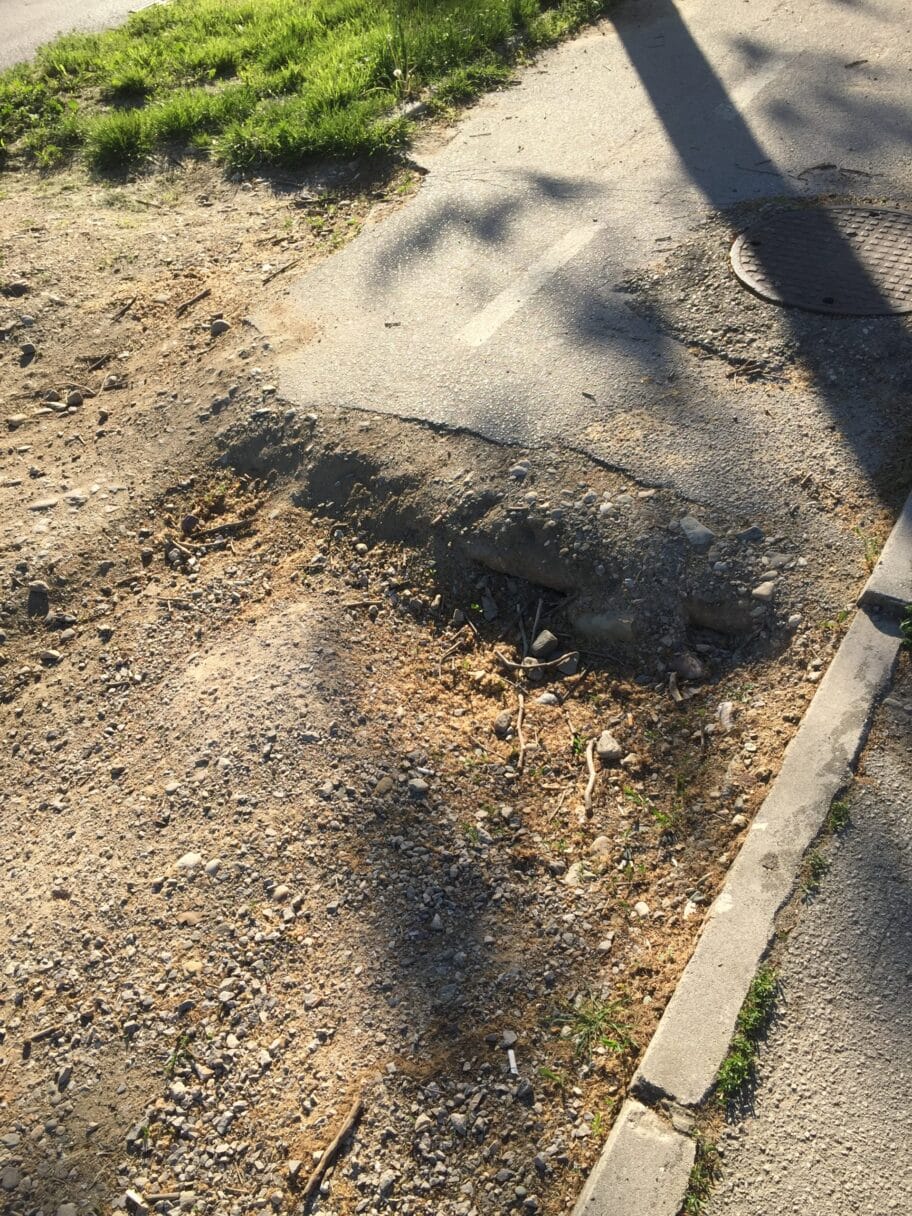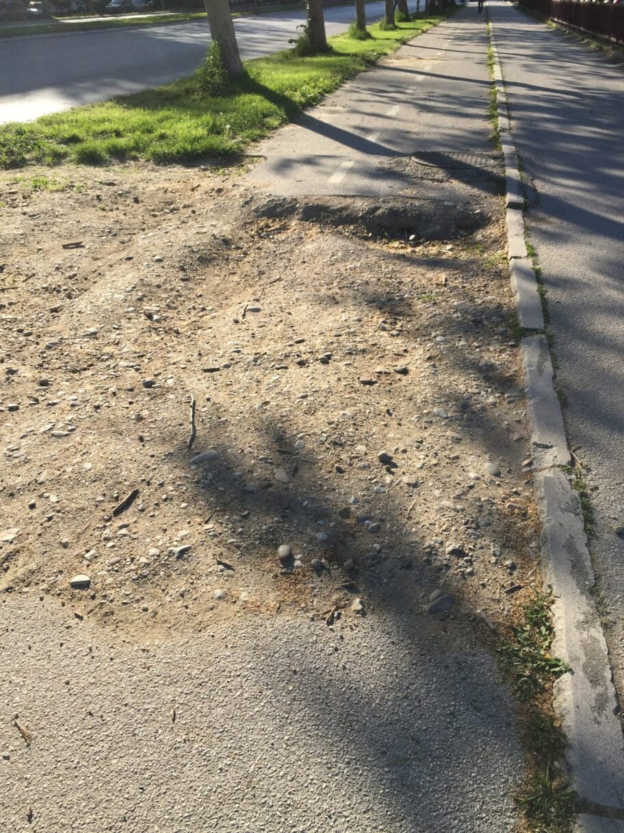 Na fotografijama je biciklistička staza na delu mosta preko Gabrovačke reke. Na tom delu nema asfalta već je zemljani put pun krupnog kamenja, a tu je i rupa/pregib između tog sloja i asfalta od 10-15 cm. Neobeleženo, nezaštićeno, i što je najgore - neosvetljeno. U večernjim časovima se uopšte ne vidi. Lokacija: Bulevar Nemanjića 83.