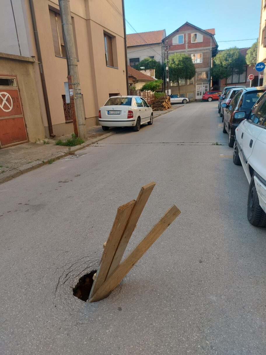 Rupa je na sredini ulice Laze Koštica, kod broja 1. Neko je unutra stavio letve.