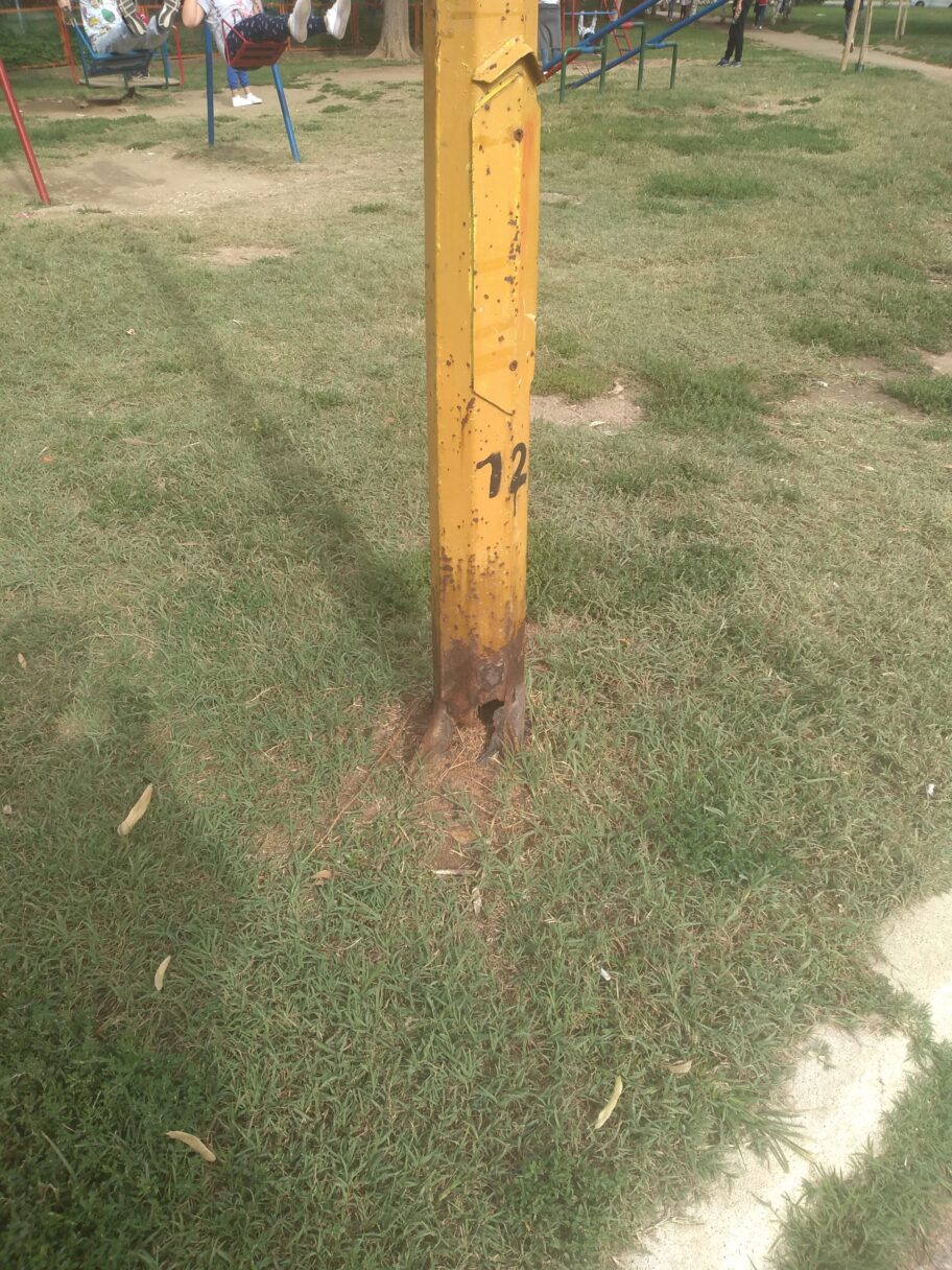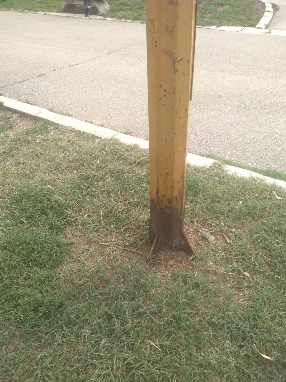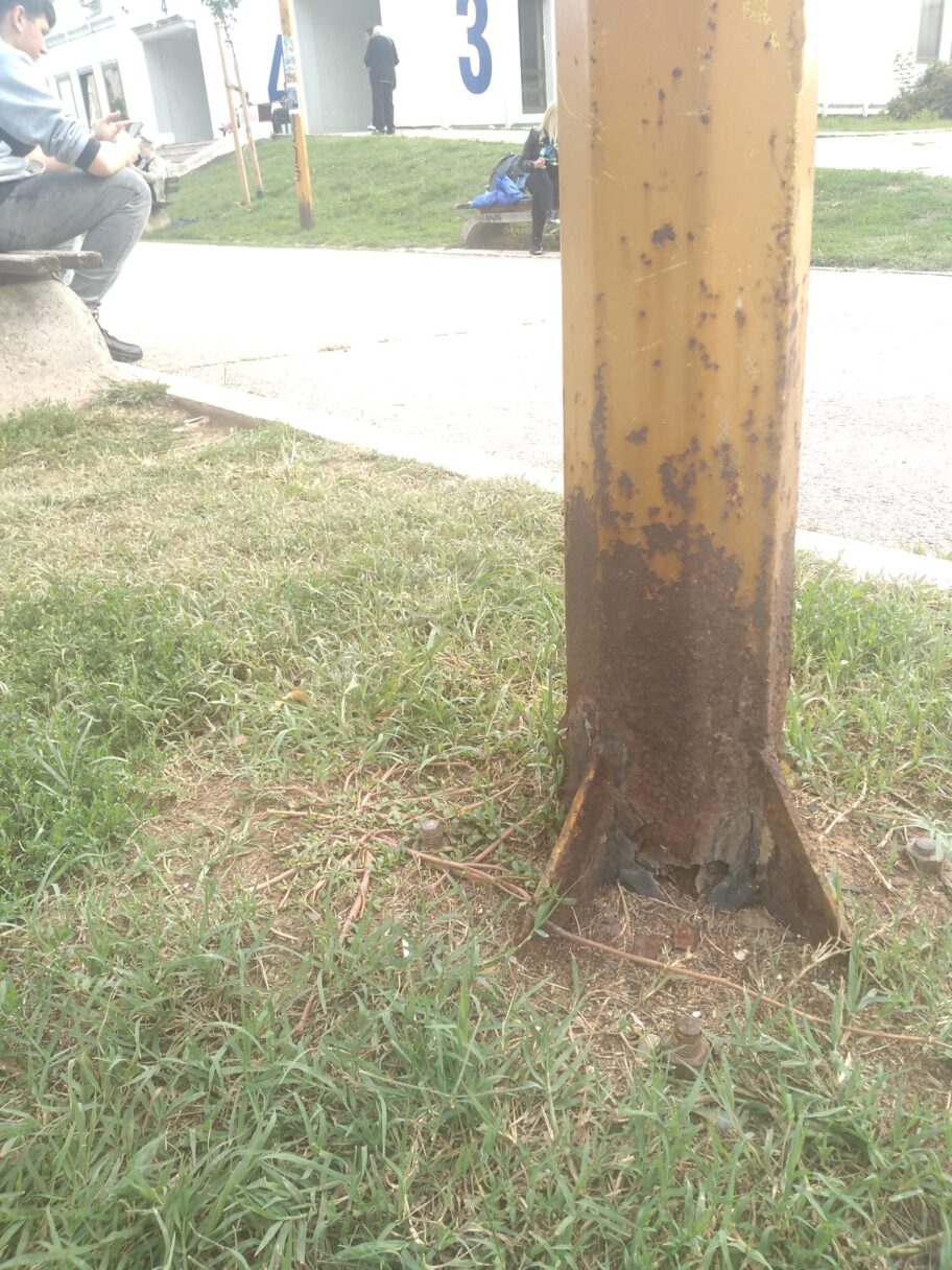 Metalna bandera rasvete, ispred ulaza broj 3 i 4 Doma zdravlja,inace ima oznaku broj 12, je u delu do zemlje istrulela sa svih strana i postoji opasnost od njenog pada jer se pri dodiru i malo jacem vetru prilicno leluja. S obzirom da taj ulaz koriste deca pretskolskog i skolskog uzrasta a i u neposrednoj blizini je decje igraliste opasnost od posledica pada je jos i veca.