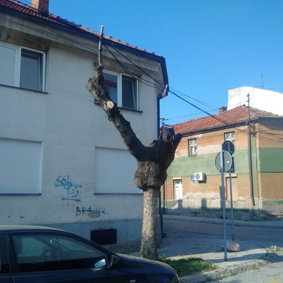 Na uglu ulica Stevana Nemanje i Kosančićeve, za suvo stablo uličnog drvoreda, firme EXE-Net i SBB vezali su svoje kablove za grane tog istog drveta. Medijana zelenilo je pokusala da iseče drvo, ali zbog kablova to nije uradila u potpunosti. Drvo je skolno padu, nekog će povrediti pod težinom kablova, a i ako se desi kidanje kablova pokidaće se i visokonaponski kablovi sa susednih bandera. Ovim putem vas molim da i vi intervenišete, da ne bi neko ili nešto slučajno nastradalo. Savesni građanin.