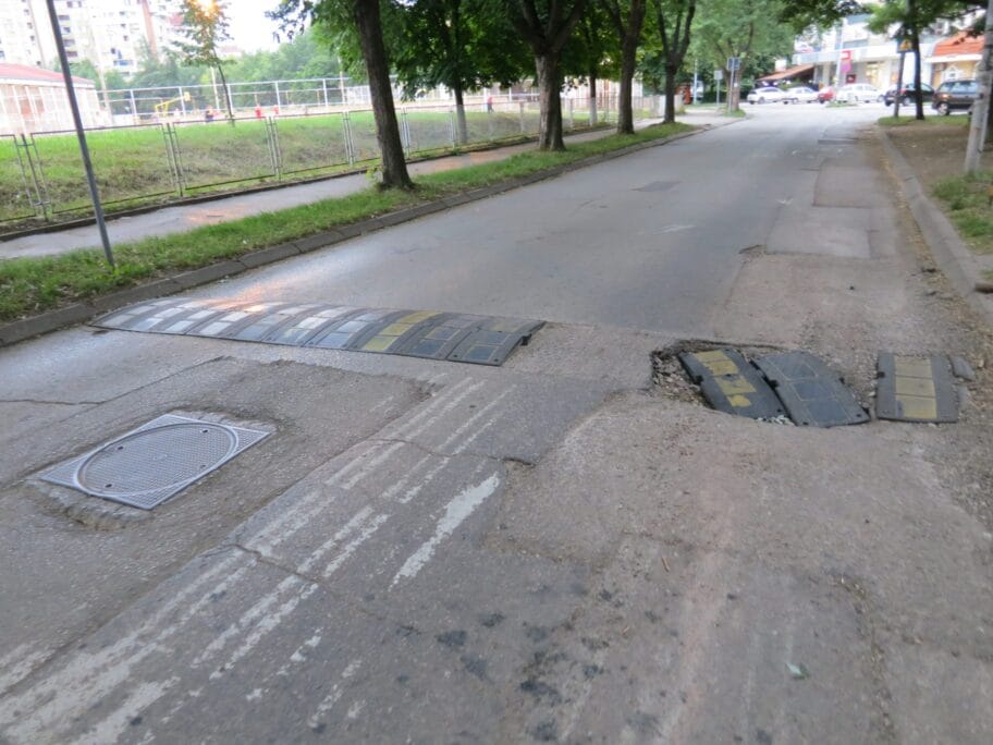 Mesecima postoji velika rupa u delu Ulice Branka Krsmanovića, prema Vizantijskom bulevaru, u delu gde je nekada postojao ležeći policajac. U rupi sa sada nalaze ostaci oštećenog ležećeg policajca. Na slici se vidi samo deo ulice Branka Krsmanovića, kao ilustracija njenog ukupnog katastrofalnog stanja. Više od 50 % ulice je iskrpljeno.