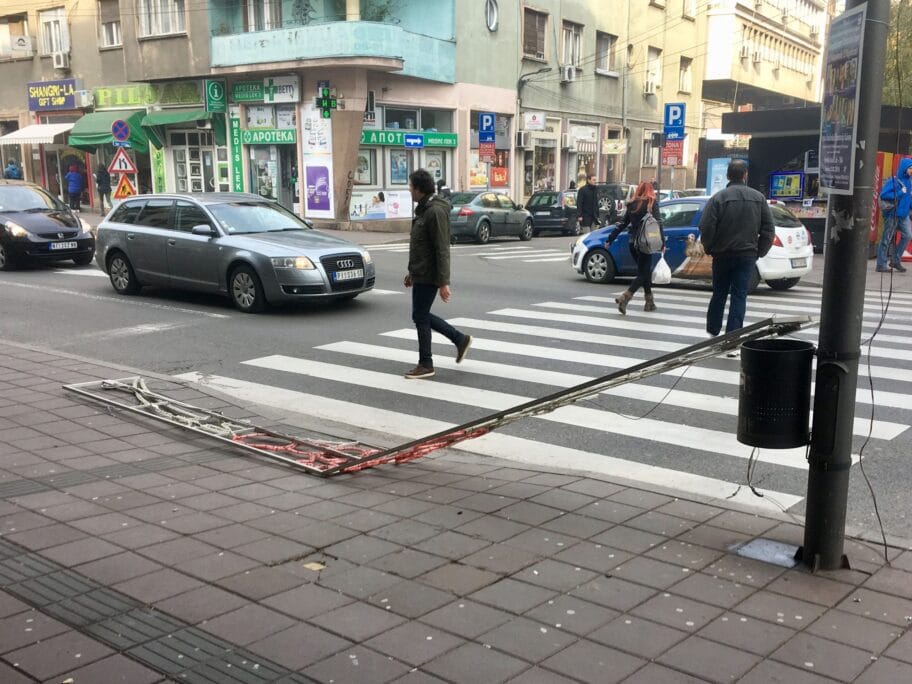 "Parking servis" postavlja novogodišnju rasvetu ispred hotela "New city", u Voždovoj ulici! Pešaci ne mogu da stupe na trotoar sa zebre, kolovoz