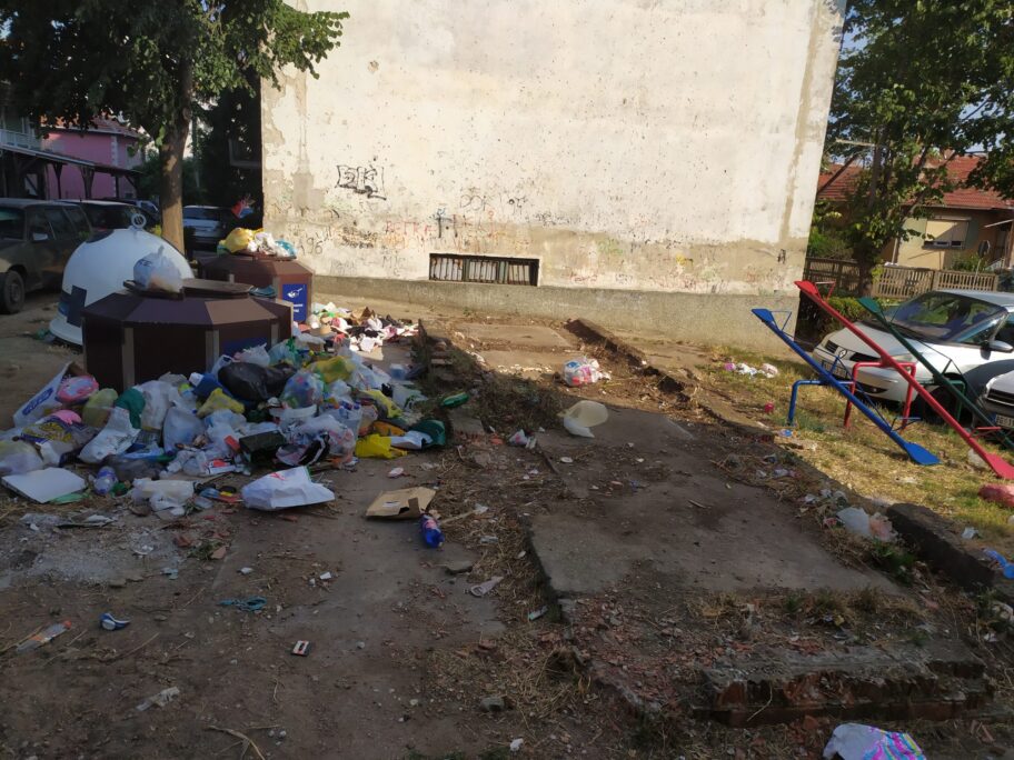 Ovo je redovna pojava u Krfskoj ulici. Smeće se neredovno odvozi pa su kontejneri i dečje igralište prepuni smećem. Fotografija je od 18. 09.2021, a smeće i dalje nije odneto iako je danas 21.09.2021.