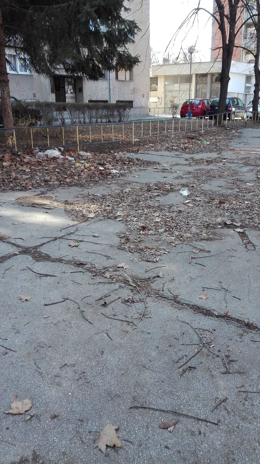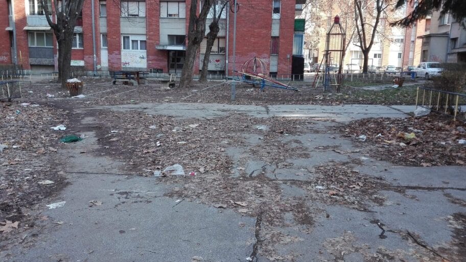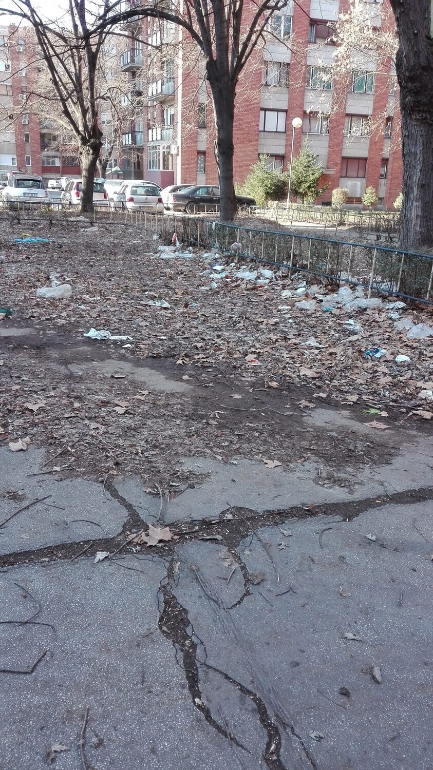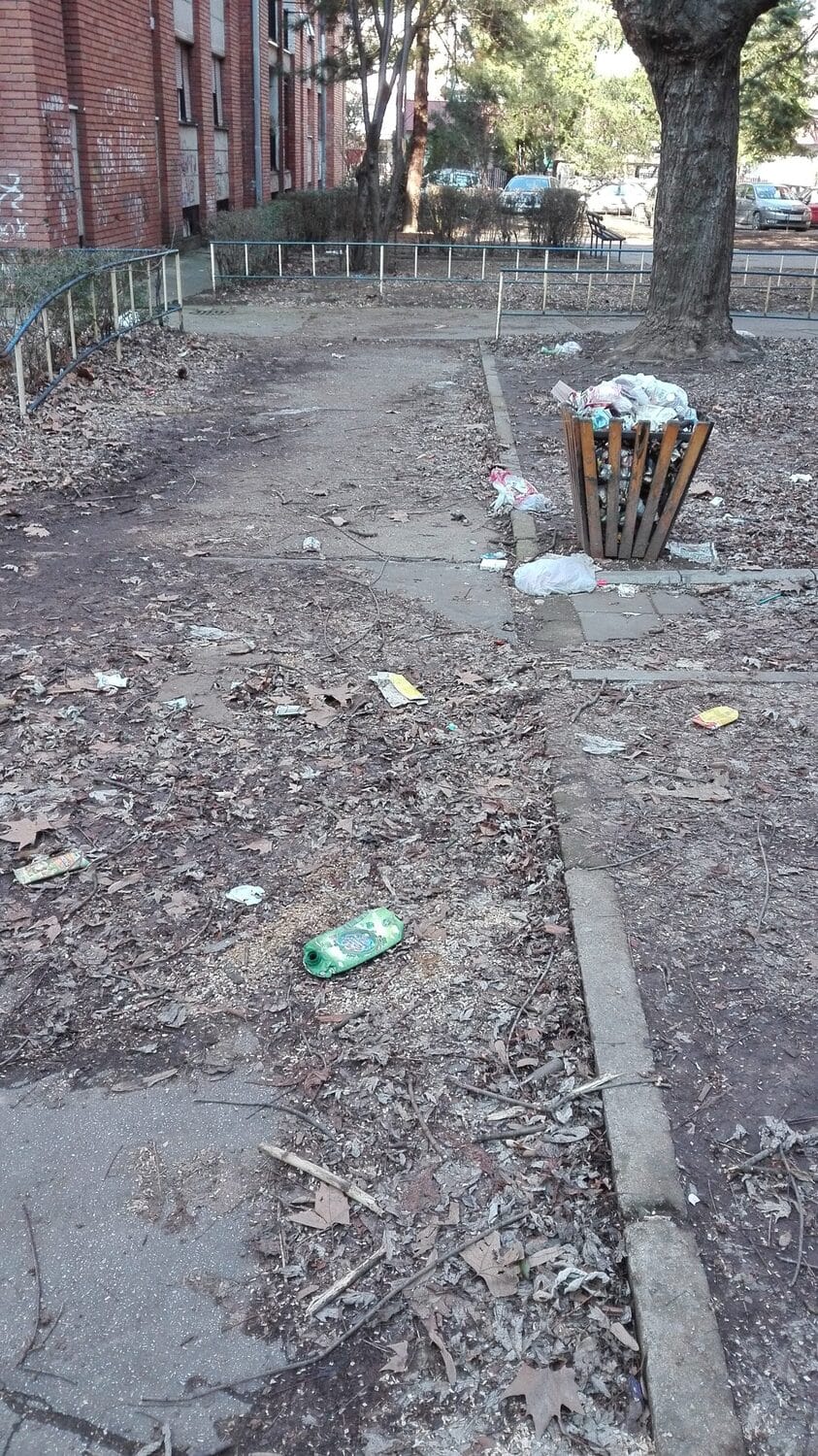 Prostor između stambenih zgrada kod Gerontološkog, koji deca koriste za igru, prepune kante za smeće i đubre koje se svuda razvuklo. Mislim da smeće nije odnošeno mesecima, kao i lisce koje je na jesen opadalo sa drveća.