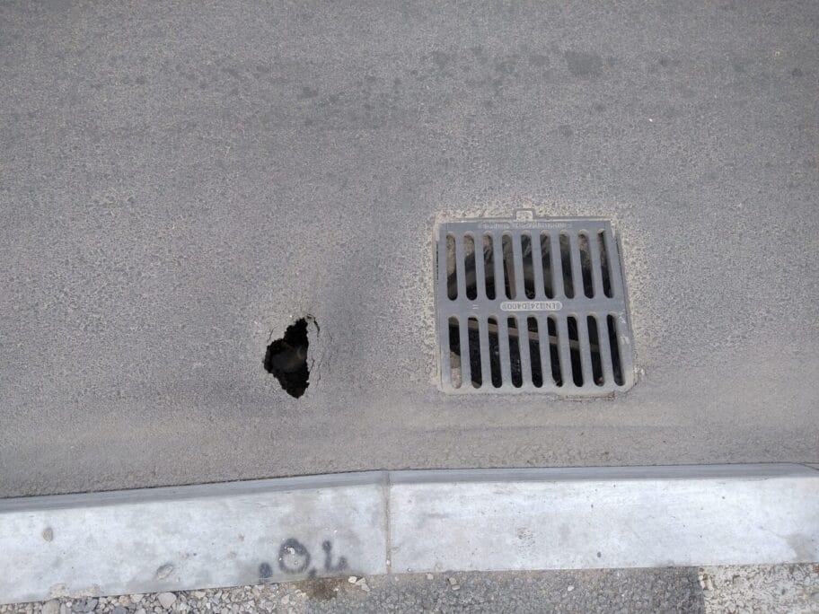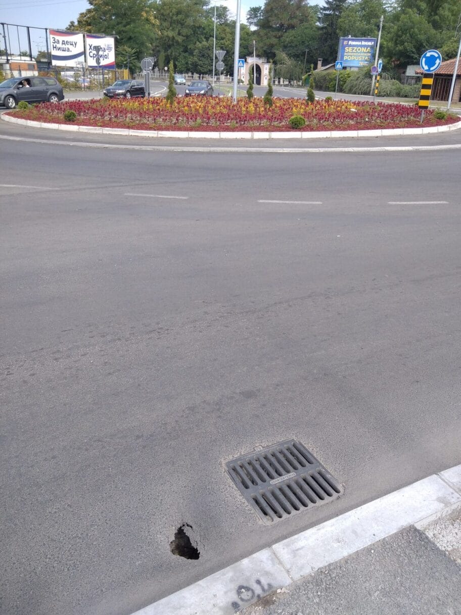 Duboka rupa (nedostaje tamponski sloj) na kolovozu na tek završenom kružnom toku kod Jagodin male.
