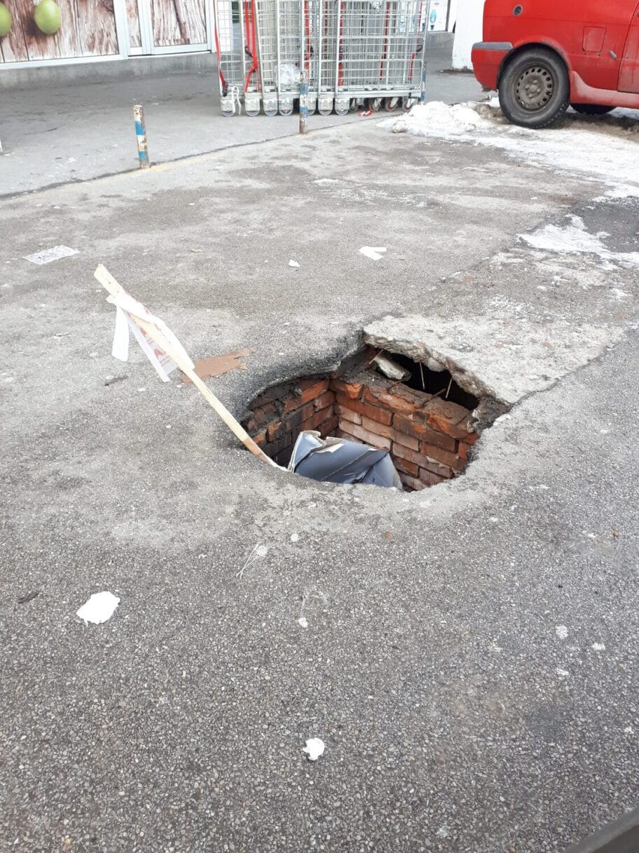 Nenormalno duboka rupa na parkingu ispred "Idee", na Obilićevom vencu, preko puta NIS pumpe...Neko ce poginuti ovde...Upašće neki auto!!!