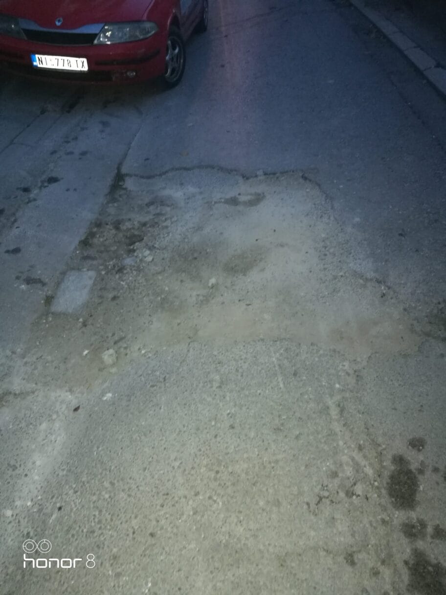 Dve udarne rupe u razmaku od 10 m na Ledenoj Steni u Ulici Oblačinska ispred broja 8 i 10. Rupa ispred broja 10 je nastala nakon sanacije vodovodne cevi početkom leta i nije asfaltirana, a rupa ispred broja 8 vec dugi niz godina stoji, nalego je asfalt u rupu koja je bila mislim iskopana za PTT. Obe rupe su velike i mora ozbiljno da se prikoči. Nekoliko pneumatika je uništeno, ove ispale ratkapne su česta pojava u ulici.
