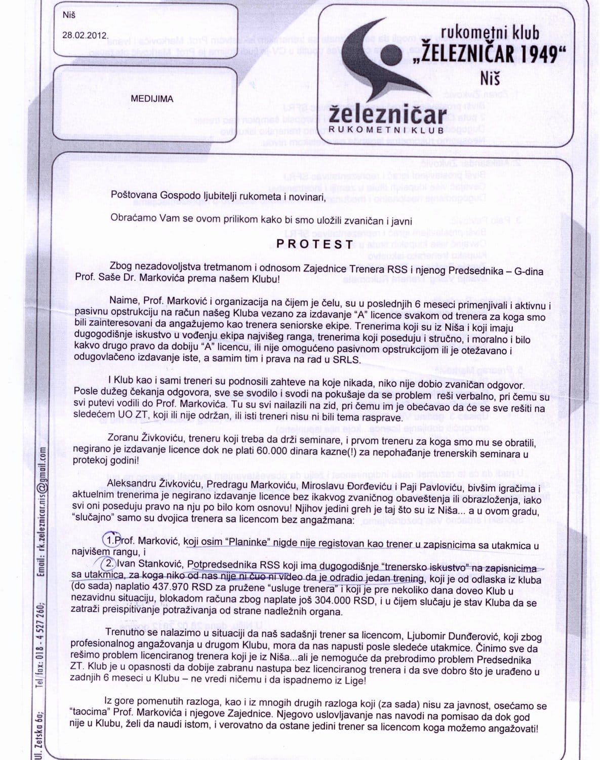 – Upućujemo protest jer smo nezadovoljni tretmanom Zajednice trenera. Nailazimo na pasivnu opstrukciju. Bili smo zainteresovani da angažujemo velika rukometna imena Aleksandra Živkovića, Predraga Markovića, Miroslava Đorđevića ili Paju Pavlovića, ali oni nisu treneri najviše lige zbog licence. U Nišu imamo samo 2 trenera sa „A“ licencom, Ivana Stankovića koji je naplatio iz kluba preko 700 hiljada dinara i Sašu Markovića koji je na čelu Zajednice – rekao je Vojislav Kraljić, direktor kluba.