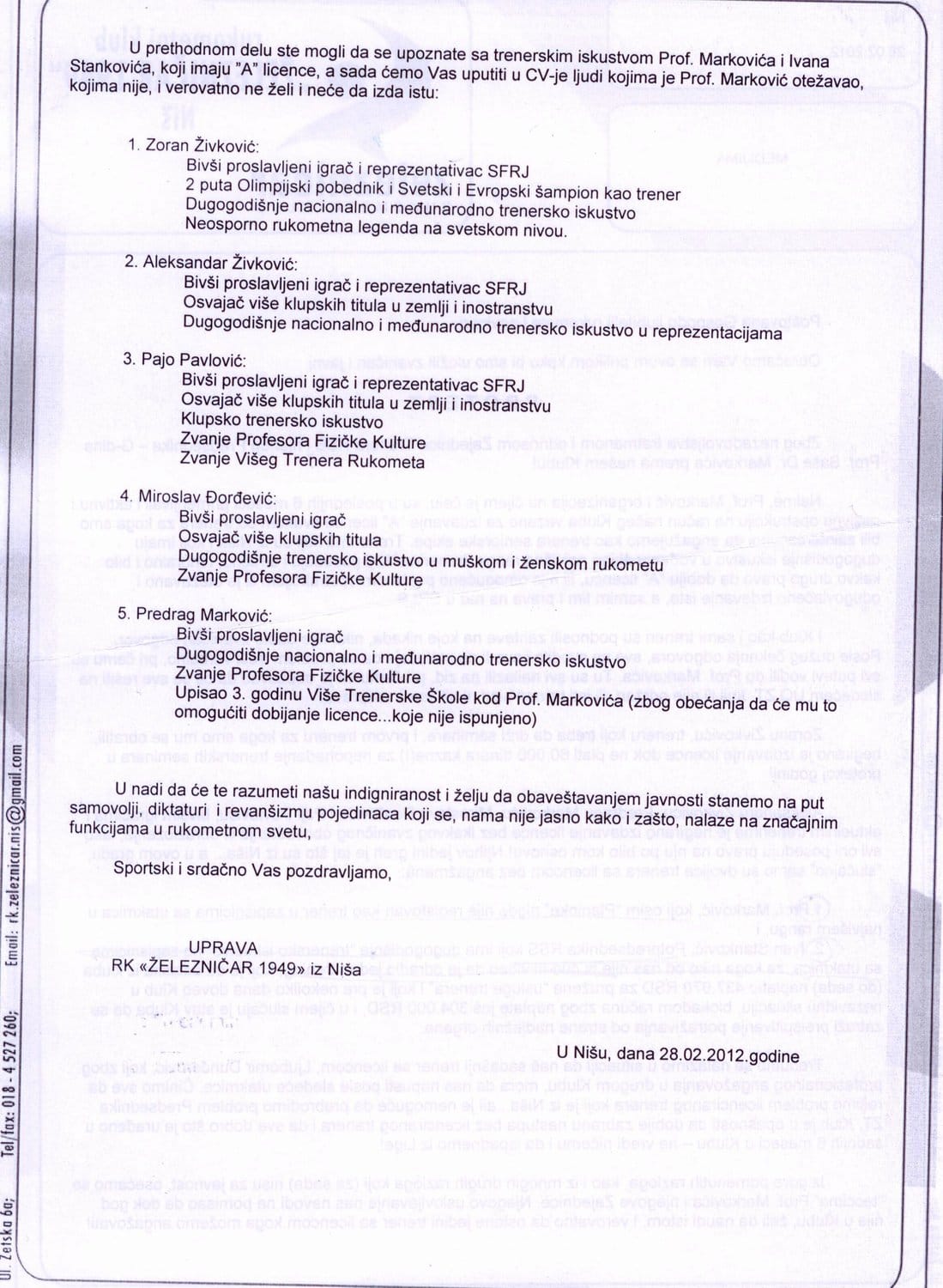 Gospodo direktori , kao sto vidite nije sve u imenu Zeleznicar, jer sadasnji rukovodioci rukometa u Srbiji se ne secaju da je zelja bio postovano ime u SFRJ.Mnogo toga mora da se uradi da bi klub ziveo i napredovao.Potrudite se da izborite opstanak. jer posle lokalnih izbora nema zutih nas vlasti nema dila sa njima.