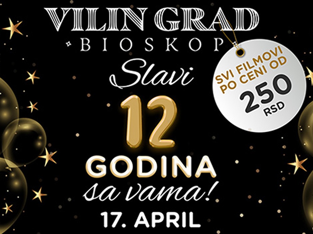 Ulaznice za sve naslove na repertoaru po ceni od 250 dinara. Bioskop Vilin Grad povodom proslave 12. godišnjice u sredu, 17. aprila, tokom čitavog dana organizovaće filmsku zabavu za svoje posetioce.