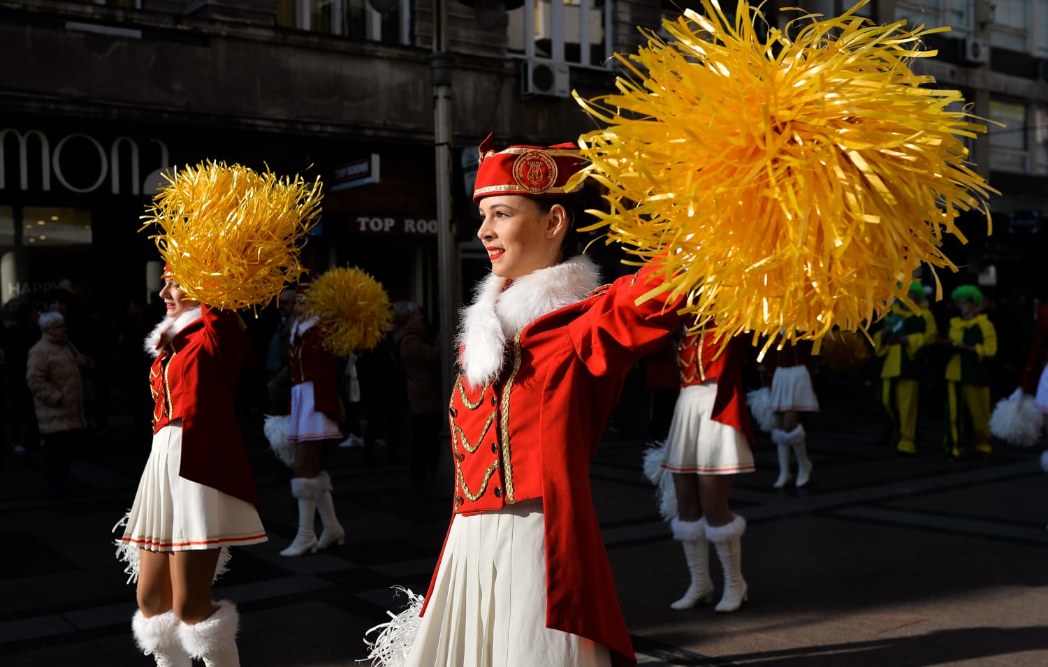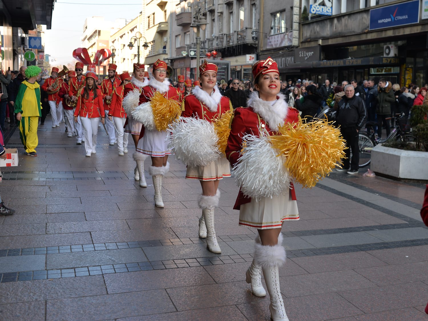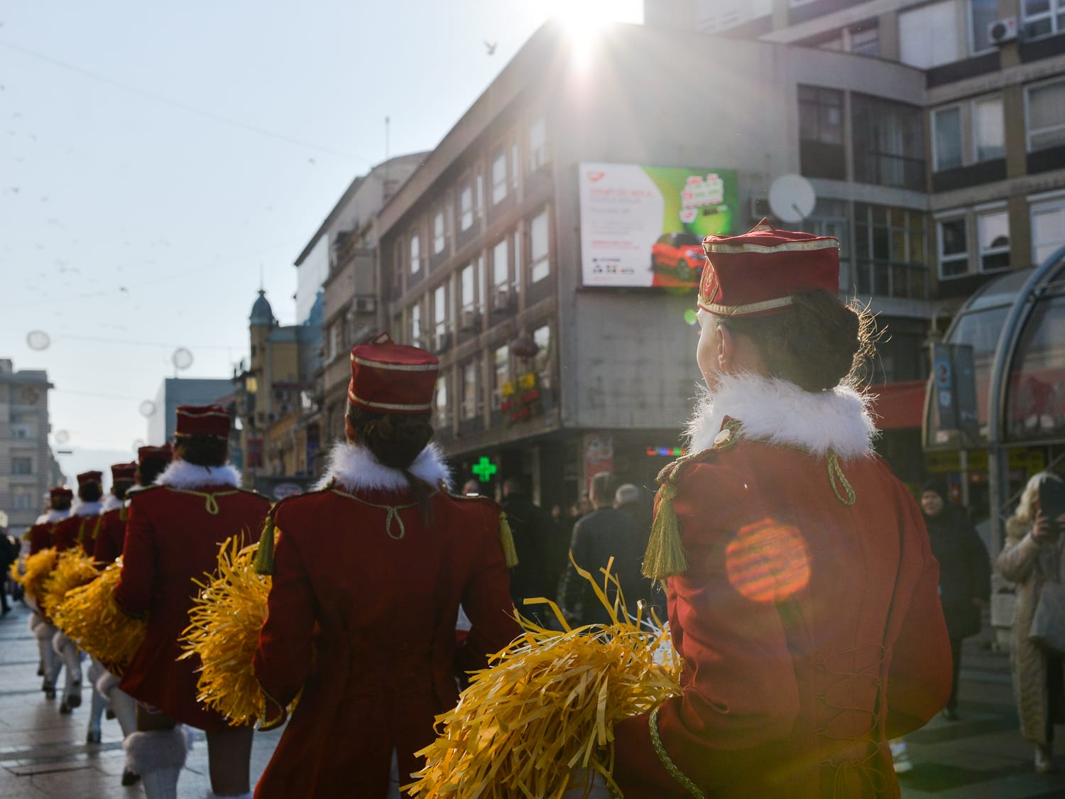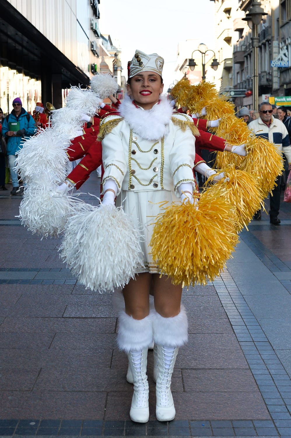 Obučene u upadljive bele haljine i crvene kapute, sa belim i zlatnim pom-pomovima u rukama, a praćene duvačkim orkestrom u sličnim odorama, mažoretkinje su prošetale kroz Obrenovićevu ulicu i izvele koreografiju.