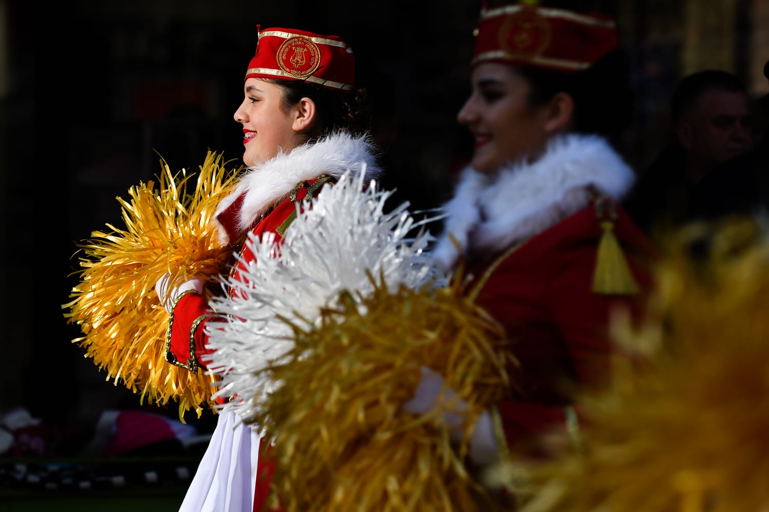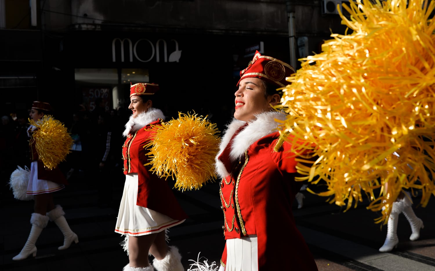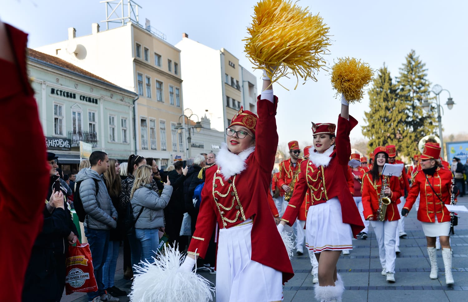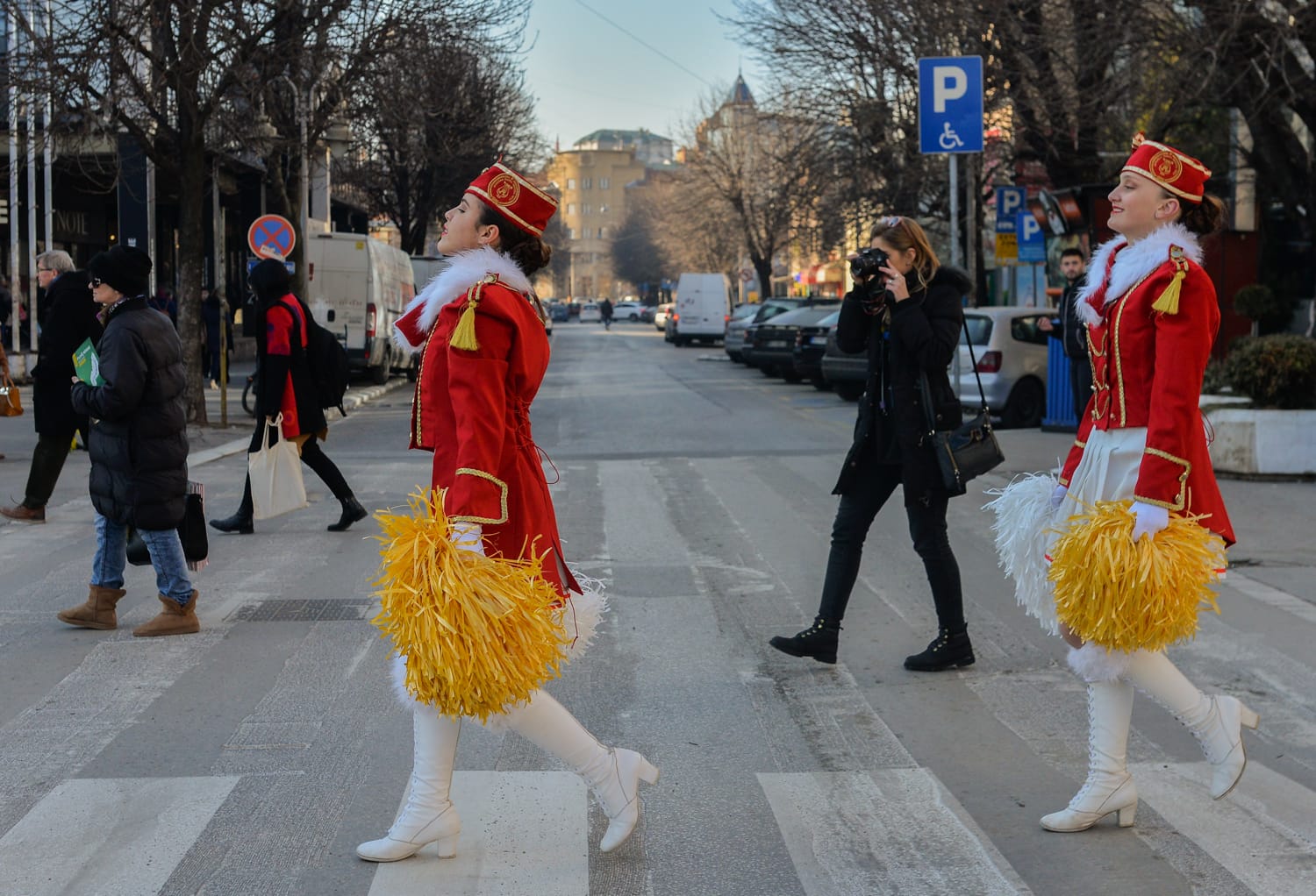 Obučene u upadljive bele haljine i crvene kapute, sa belim i zlatnim pom-pomovima u rukama, a praćene duvačkim orkestrom u sličnim odorama, mažoretkinje su prošetale kroz Obrenovićevu ulicu i izvele koreografiju.